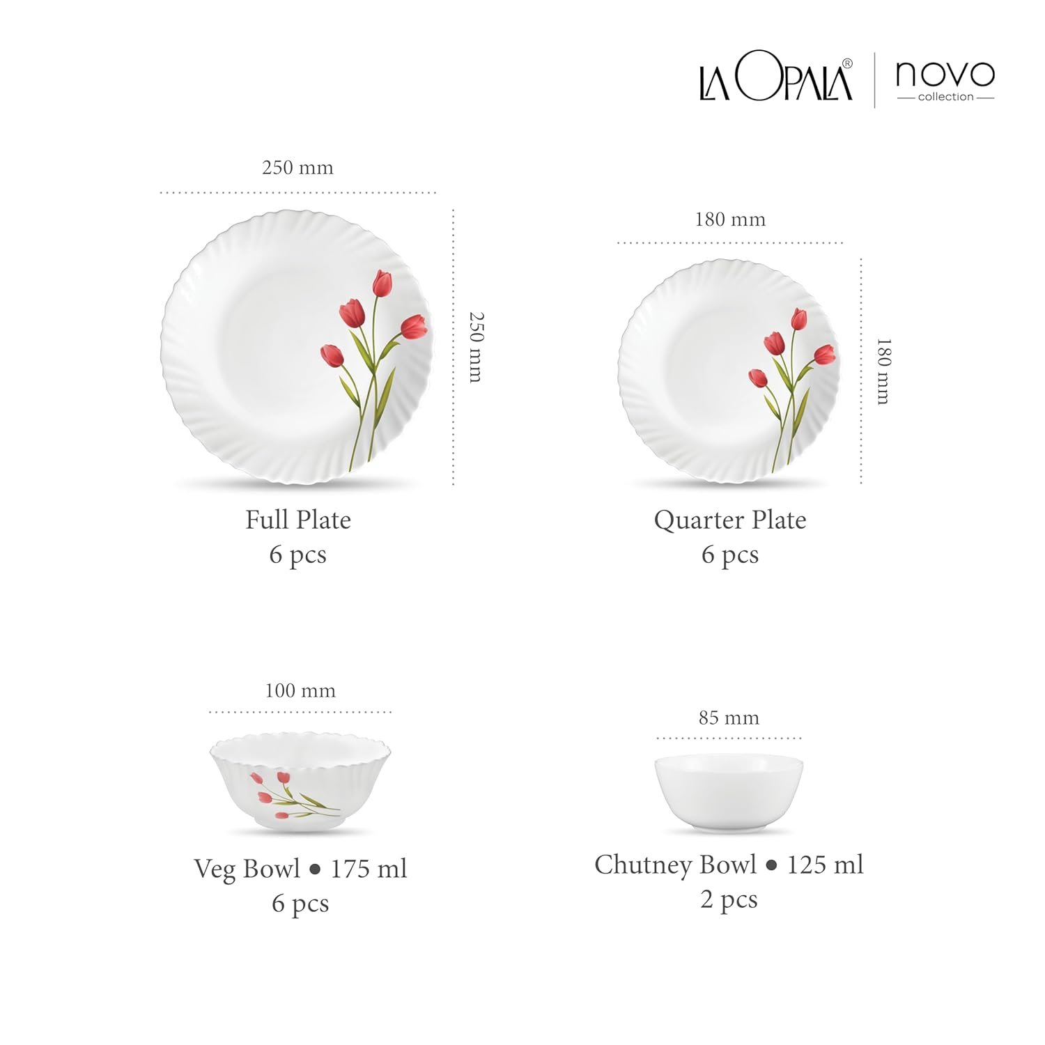 FULL PLATE 250MM 6 PCS QUARTER PLATE 180MM 6 PCS VEGETABLE BOWL 175ML 6 PCS CHUTNEY BOWL 125 ML 2 PCS